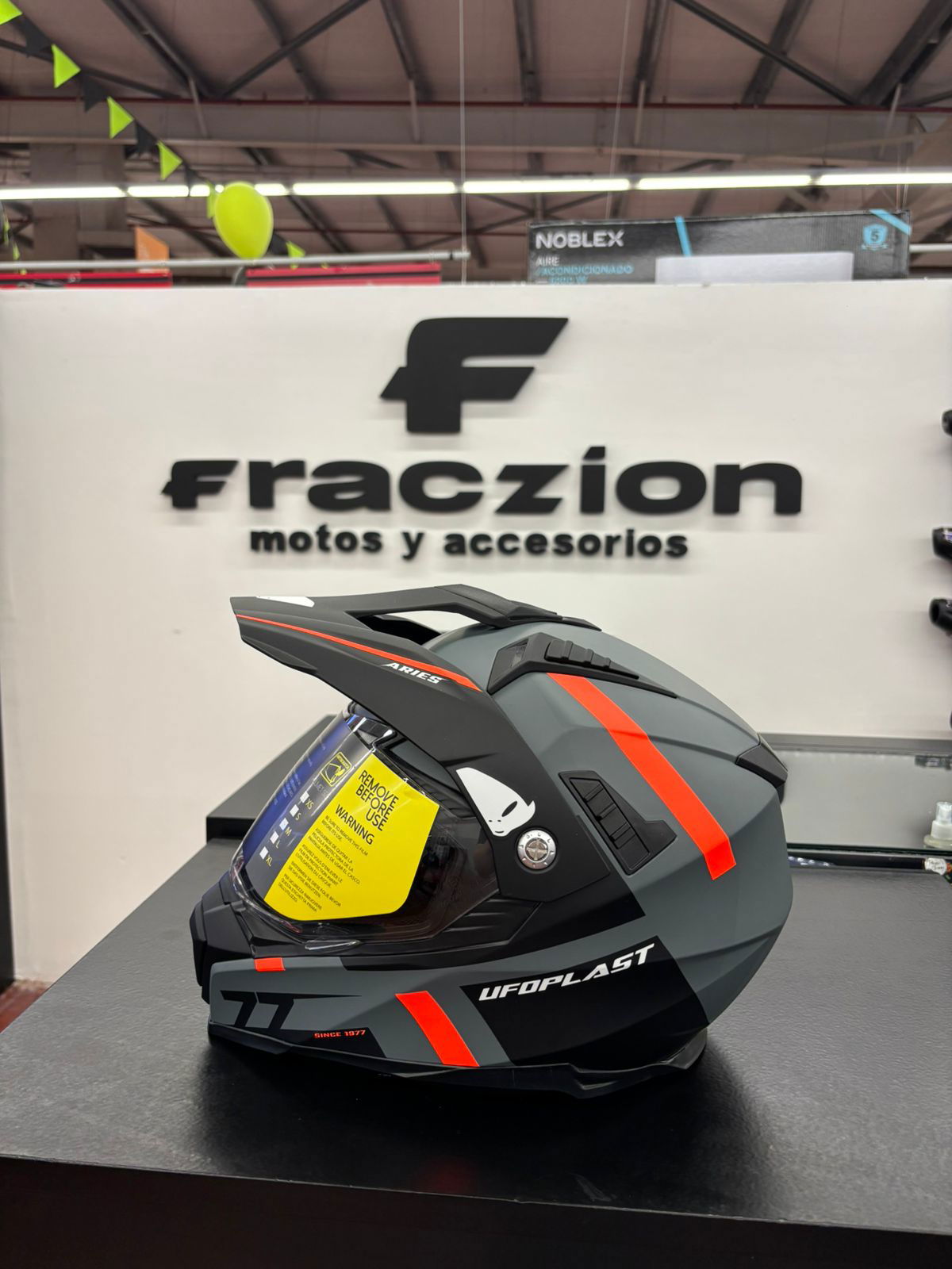El UFO Aries es un casco dual-purpose de estilo enduro/adventure (off-road + ruta) diseñado para brindar versatilidad, comodidad y protección en rutas mixtas: tanto para tierra como para asfalto. Su doble visor y buena ventilación lo convierten en una opción atractiva para quienes alternan ciudad, carretera y caminos menos preparados.