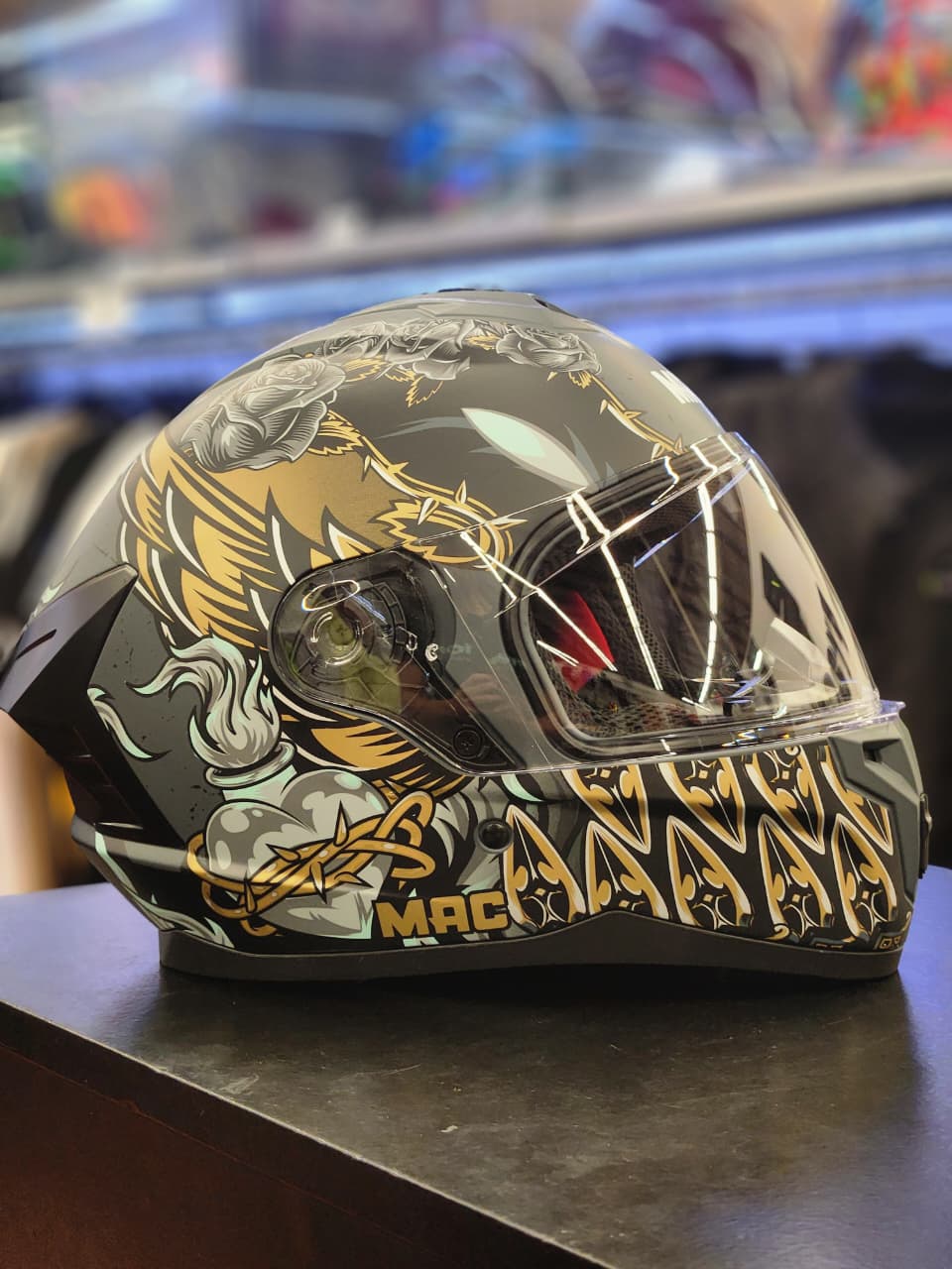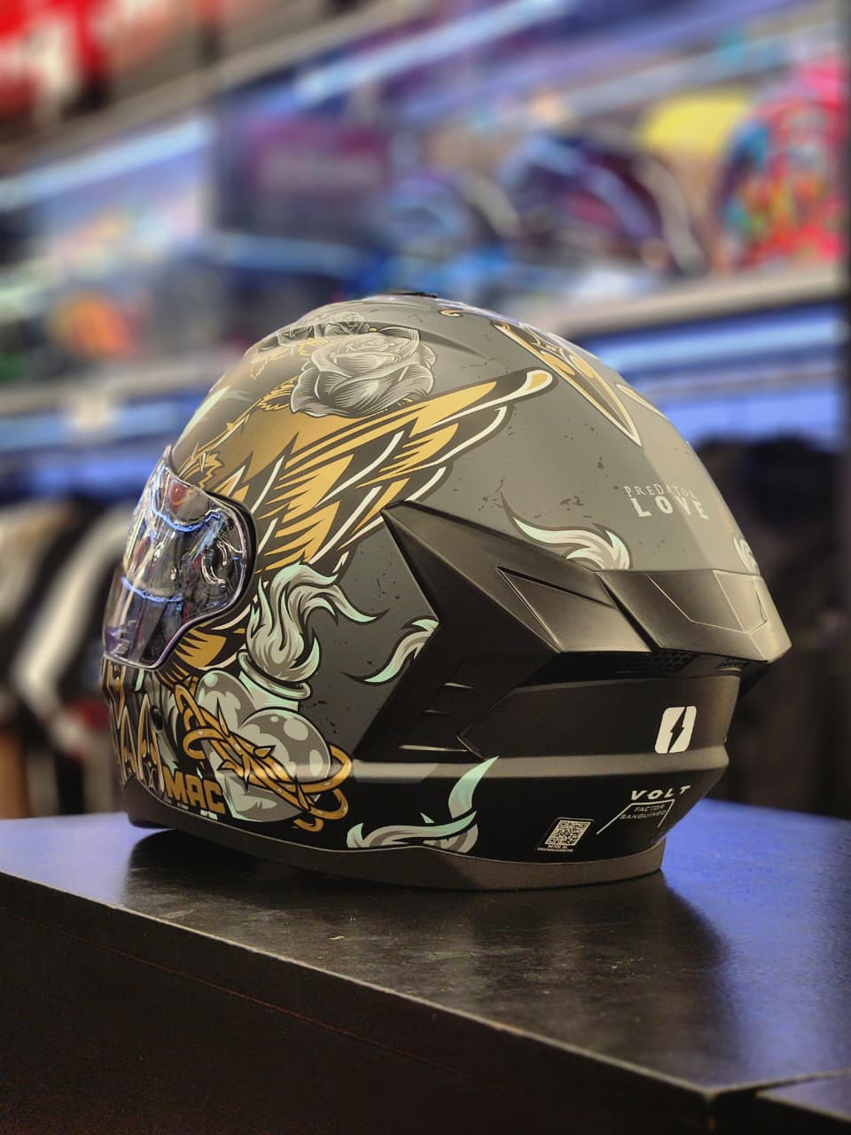 El Casco Moto Integral Mac Love Predator (también disponible en variantes como Casco Integral FF070 Volt Love Predator Mac y Casco Mac Love Predator Black Gold) es un casco integral de la marca MAC, construido con calota termoplástica ABS de alta resistencia y certificación de seguridad ECE que lo hace apto para uso urbano y en ruta. Viene con visor transparente con tratamiento anti-arañazos y está preparado para visor oscuro/espejado intercambiable, un sistema de ventilación con entradas y salidas de aire bien distribuidas y acolchado interior transpirable y desmontable para mayor confort en viajes largos y conducción diaria.